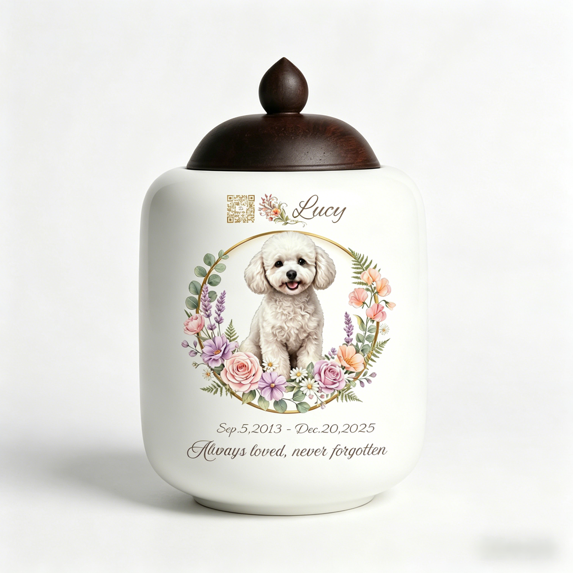 Custom Artisan Pet Urn with Digital Memorial QR Code & Hand-Painted Wreath